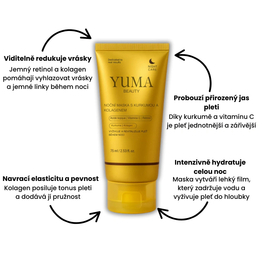 Kolagen zpevňuje pleť, kurkuma a vitamín C rozzáří tón pleti, zatímco retinol jemně působí na vyhlazení vrásek.